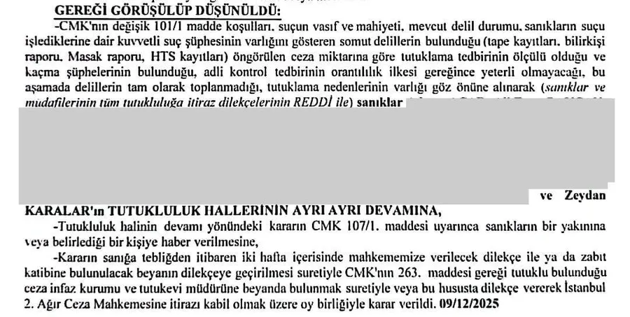“Tutukluluğumun devamına dair kararda "tape kayıtları, bilirkişi raporu, HTS kayıtları, Masak raporu" kuvvetli suç şüphesi delili olarak gösterildi. Oysa dosyada benimle ilgili tape kaydı yok, bilirkişi raporu yok, Masak raporu yok, benimle ilgili ve aleyhe HTS kaydı da yok. Karara gerekçe gösterilen bu kayıtları mahkemeye sunduğumuz dilekçe ile talep ettiysek de henüz yanıt alamadık. Kamuoyunun takdirine bırakıyorum.”