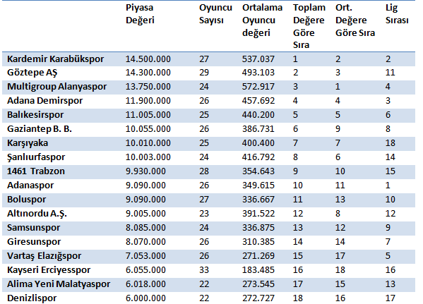 PTT 1.ligde mücadele eden takımlar arasında 14.5 milyon Avro ile piyasa değeri en yüksek olan takım Kardemir Karabükspor. Onu sırasıyla Göztepe (14.3), Alanyaspor (13.7) ve Adana Demirspor (11.9) milyon Avro ile takip ediyor. Yaklaşık 6 milyon Avro’luk piyasa değeri ile Kayseri Erciyesspor, Yeni Malatya ve Denizlispor ise en düşük değere sahip 3 takım olarak dikkatleri çekiyor. Ancak takımların kadrolarında bulundurdukları oyuncu sayısı birbirinden farklı bu nedenle toplam değer yanıltıcı olabilir. Örneğin Göztepe kadrosunda 29 oyuncu bulundururken Alanyaspor 24 oyuncu bulunduruyor. Bu nedenle oyuncu başına piyasa değerlerine baktığımızda PTT 1.Lig’inin piyasa değeri en yüksek takımı Alanyaspor oyuncu başına 572 milyon Avro değere sahip. Onu Kardemir Karabükspor (537.037), Göztepe (493.103) ve Adana Demirspor (457.692) ile izliyor. Oyuncu başına en düşük piyasa değerine sahip olan takımlar ise Denizli, Malatya ve Kayseri Erciyesspor. Eğer Piyasa değeri ile saha başarısı arasında doğrudan bir ilişki olsaydı PTT 1.Lig’inin İlk 3 Sırasında Toplam Piyasa Değerine göre Kardemir Karabükspor, Göztepe ve Alanyaspor, ikinci seçenekte ise ortalama oyuncu piyasa değerine göre ise Alanya, Karabük ve Göztepe şeklinde bir sıralama çıkması gerekirdi. Son 3 sırada ise Denizli Erciyes ve Yeni Malatya’nın olması gerekirdi.