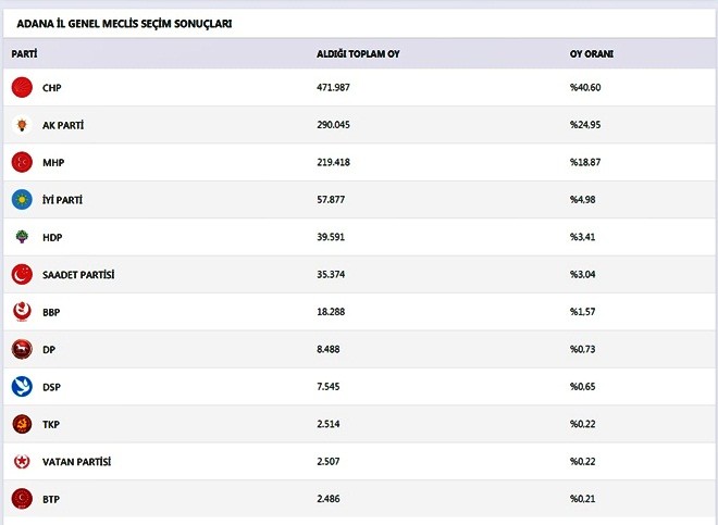 Adana’da İl Genel meclisi oy oranları şöyle: