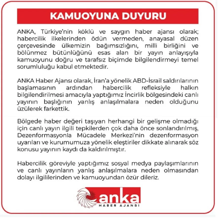 Bu arada ANKA Haber Ajansı da konuyla ilgili yazılı bir açıklamayla özür diledi. ANKA’ nın açıklaması şöyle: