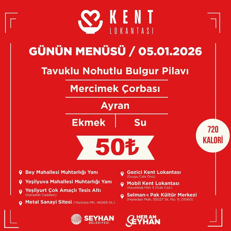Seyhan Belediyesi kent lokantası menüzünü her gün sosyal medyadan duyuruyor. 5 Ocak menüsü şöyle: