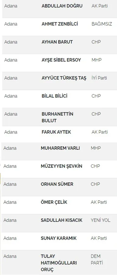 TBMM kayıtlarına göre, Adana’nın 15 milletvekillinden 5’i CHP’li, 4’ü Ak Partili, 2’si MHP’li, 1’i İyi Parti, 1’i DEM Parti, 1’i Yeni Yol, milletvekillerinden biri de bağımsız.
