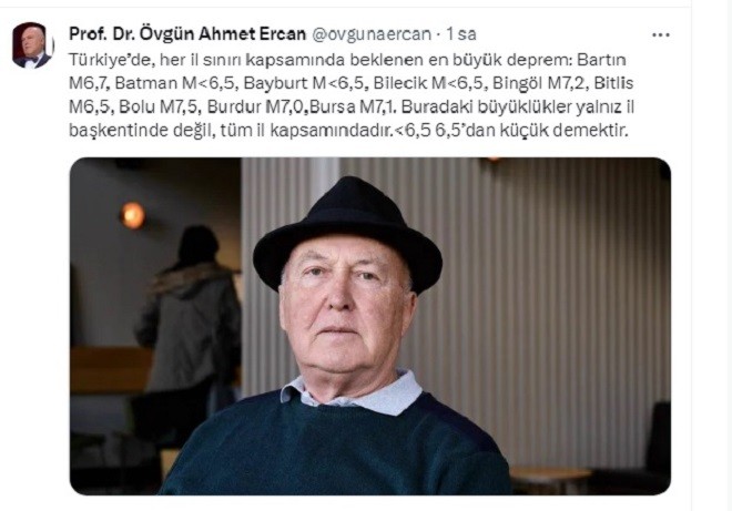 “Türkiye il sınırları kapsamında görebileceği en büyük deprem: Adana M7,1, Adıyaman M6,9, Afyon M6,9, Ağrı M7,5, Aksaray M6,5, Amasya M7,3, Ankara M6,6, Antalya M7,0(!),Ardahan M6,5, Artvin M6,5, Aydın M7,3(Öteki iller için yarın sürecek.). Ortalama yıkıcılık eşik değeri M6,5’dur)