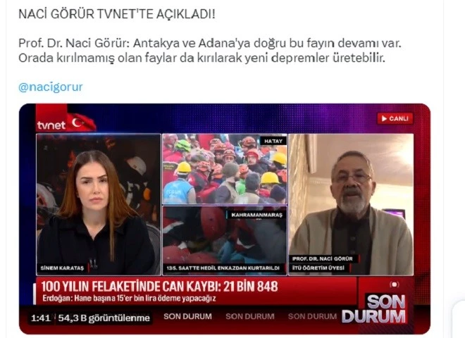 Prof. Dr. Naci Görür, TVNET’te yaptığı açıklamada “Antakya ve Adana'ya doğru bu fayın devamı var. Orada kırılmamış olan faylar da kırılarak yeni depremler üretebilir.” Ifadelerine yer verdi.