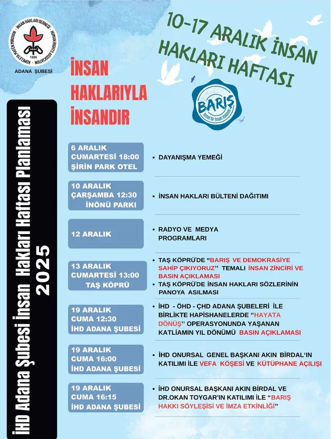 İnsan Hakları Derneği Adana Şubesi tarafından İnsan Hakları Haftasından geleneksel Dayanışma yemeği düzenlendi.