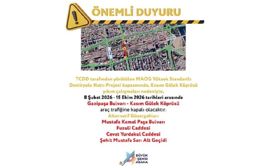“TCDD tarafından yürütülen MAOG Yüksek Standartlı Demiryolu Hattı Projesi kapsamında, Kasım Gülek Köprüsü yıkım çalışmaları nedeniyle, 8 Şubat 2026 - 15 Ekim 2026 tarihleri arasında Gazipaşa Bulvarı - Kasım Gülek Köprüsü araç trafiğine kapalı olacaktır. Sürücülerin alternatif güzergahları kullanmaları rica olunur.”