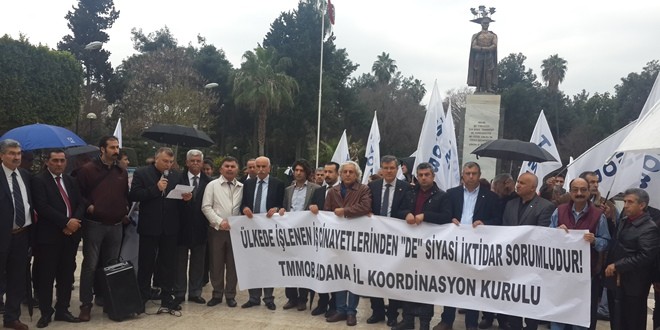 TMMOB Adana İl Koordinasyon Kurulu(İKK) tarafından “İş Cinayetlerine Karşı Mücadele Günü” nedeniyle Atatürk Parkı’nda eylem yaptı. CHP İl Başkanı Ayhan Barut ve il, ilçe yöneticilerinin de katıldığı eylemde hazırlanan bildiriyi Maden Mühendisleri Odası adına Mehmet Yılmaz okudu. Yılmaz açıklamasında şu görüşlere yer verdi: