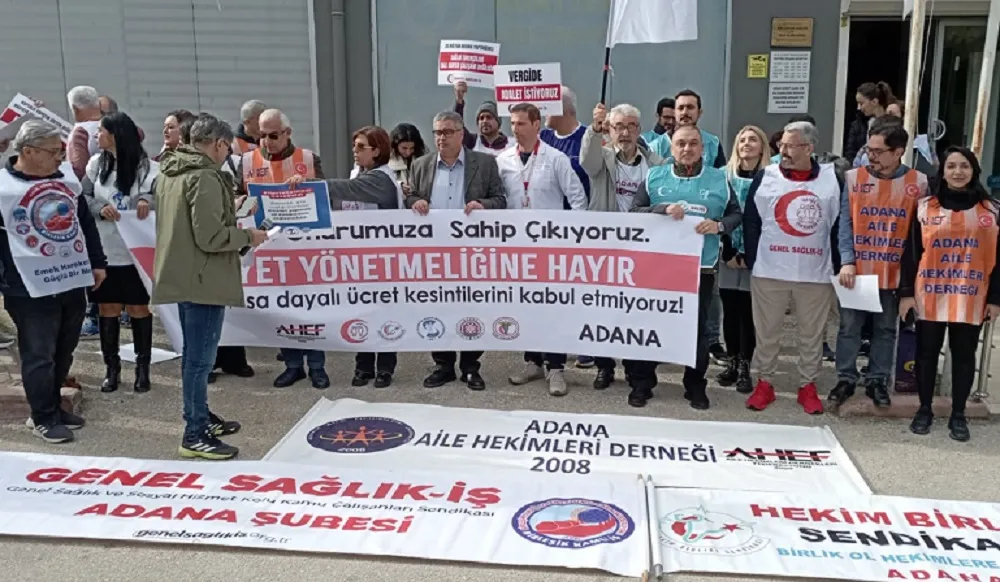 Adana Tabip Odası, Sağlık ve Sosyal Hizmet Emekçileri Sendikası (SES) Adana Şubesi, Genel Sağlık-İş Sendikası Adana Şubesi, Hekim Birliği Sendikası ve Aile Hekimleri Dernekleri Federasyonu (AHEF) tarafından “Eziyet Yönetmeliğine Hayır” eylemi yapıldı.