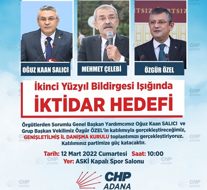 CHP Adana İl Başkanlığı’ndan yapılan açıklamaya göre, 12 Mart Cumartesi Saat