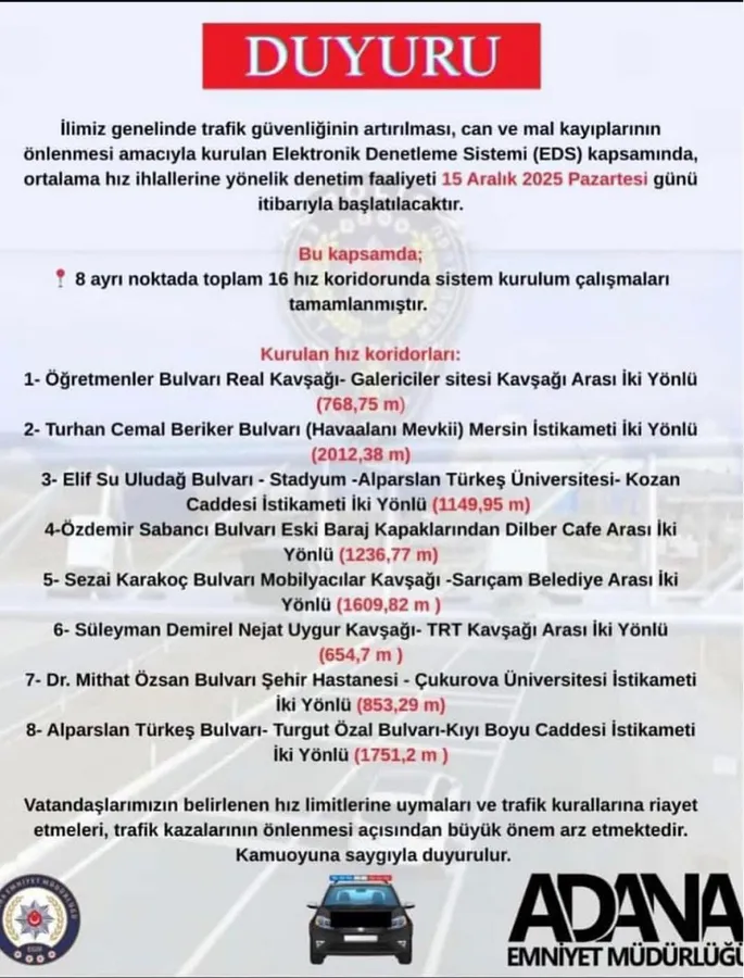 Elektronik Denetleme Sistemi Adana’da bu 8 ayrı noktada 16 hız koridorunda uygulamaya başlıyor.