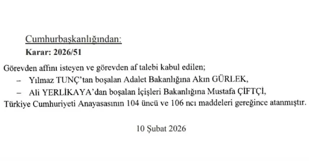 Adalet Bakanı Yılmaz Tunç ve İçişleri Bakanı Ali Yerlikaya’nın yerlerine yeni atama yapıldı. Cumhurbaşkanı kararı Resmi Gazetede yayınlandı. İçişleri Bakanlığına Erzurum Valisi Mustafa Çiftçi, Adalet Bakanlığına ise İstanbul Cumhuriyet Başsavcısı Akın Gürlek atandı.
