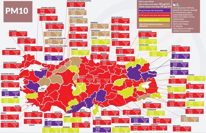 Çevre Mühendisleri Odası’nın raporuna göre, hava kirliliği sorununa dikkat çekmek ve çözüm önerileri sunmak için her yıl hazırladığı hava kirliliği raporuna göre, güvenli hava kirliliği verisinin alındığı toplam 45 farklı ildeki istasyonlarda yapılan ölçümler, bu bölgelerde yaşayan yaklaşık 60 milyon kişinin yılın ulusal sınır değerlerin üzerinde PM10 (toz) seviyesine maruz kaldığını ortaya koyuyor.