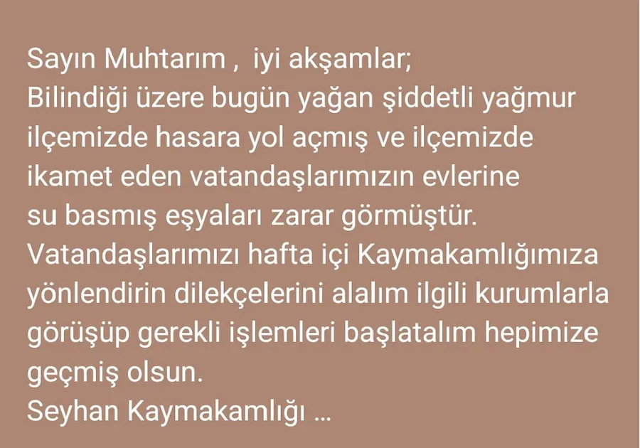 Seyhan Kaymakamlığı da muhtarlar birer yazı göndererek yağmurdan etkilenen vatandaşların en kısa sürede başvuru yapılmasını istedi. Kaymakamlık yazısı şöyle: