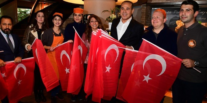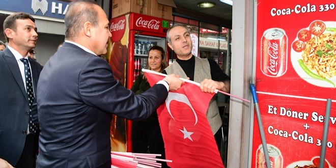Hüseyin Sözlü, konuşmasının ardından Atatürk Caddesi’nde esnaf ve vatandaşlara Türk Bayrağı verdi, bayrakları esnafla birlikte astı.