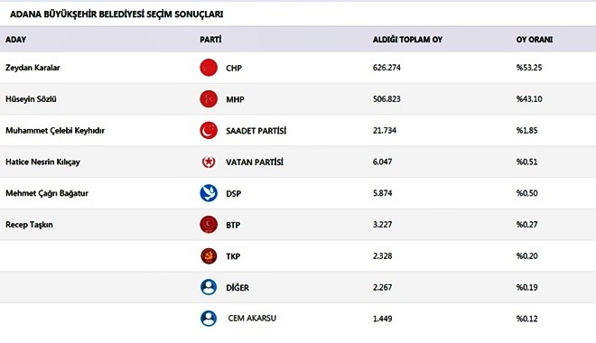 Adana’da Büyükşehir Belediye Başkan adayları oy oranları :