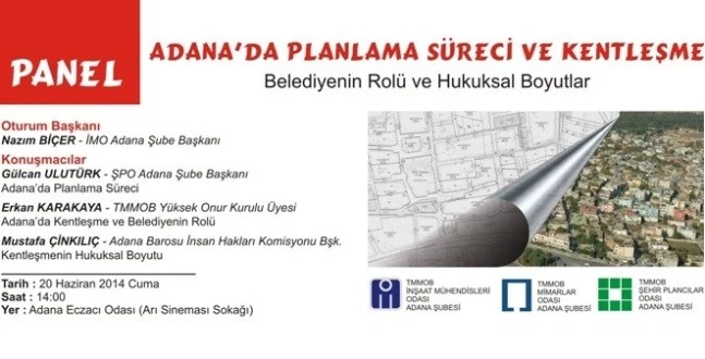 Türk Mühendis ve Mimar Odaları Birliği (TMMOB) İnşaat Mühendisleri Odası (İMO), Şehir Plancıları Odası (ŞPO) ve Mimarlar Odası Adana Şubeleri, “Adana’da Planlama Süreci ve Kentleşme” konulu panel düzenledi.Panel, 20 Haziran Cuma günü saat 14.00’da Adana Eczacı Odası’nda gerçekleşecek. Ortak panelde sorunlar ve çözüm yolları ile belediyenin rolü ve hukuksal boyutlar irdelenecek.