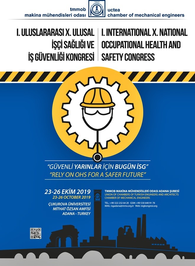 Makina Mühendisleri Odası Adana Şubesinin düzenleyeceği I.Uluslararası X.Ulusal İşçi Sağlığı ve İş Güvenliği Kongresi 23-26 Ekim 2019 tarihlerinde Çukurova Üniversitesinin ev sahipliğinde Mithat Özsan Amfisinde 4 gün sürecek.