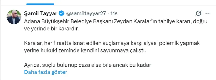 Ak Parti Gaziantep geçmiş dönem Milletvekili Şamil Tayyar Adana Büyükşehir Belediye Başkanı Zeydan Karalar’ın tahliyesi ile ilgili, “Doğru ve yerinde bir karardır. Adalet iyidir” dedi.