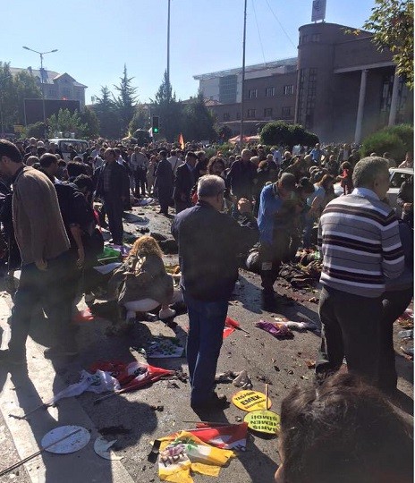 Ankara’da düzenlenen Barış Mitinginde 2 ayrı patlama. Ankara Tren garındaki patlamada yaralılar olduğu bildiriliyor. KESK, DİSK, TMMOB ve TTB tarafından bugün Ankara’da “Barış Mitingi” düzenlendi. Yurdun çeşitli kentlerinden gelen kortej yürüyüşe başlayacağı sırada saat 10.00 sıralarında Ankara Tren garında 2 ayrı patlama olduğu bildirildi. Patlama ile ilgili henüz resmi açıklama yapılmadı. Miting katılanların çektiği fotoğraf ve görüntüler sosyal medyada paylaşılmaya başlandı. Patlamada çok sayıda yaralı olduğu belirtiliyor.