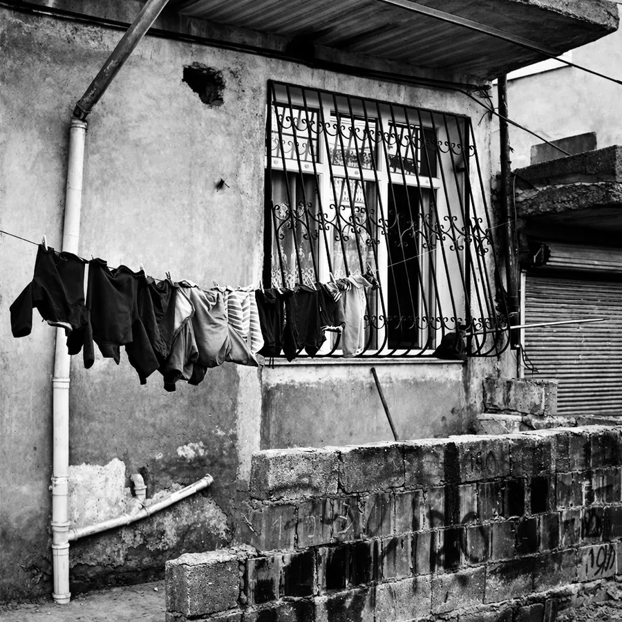 Önünde çamaşırların asılı olduğu. Öylesine atılıvermiş.