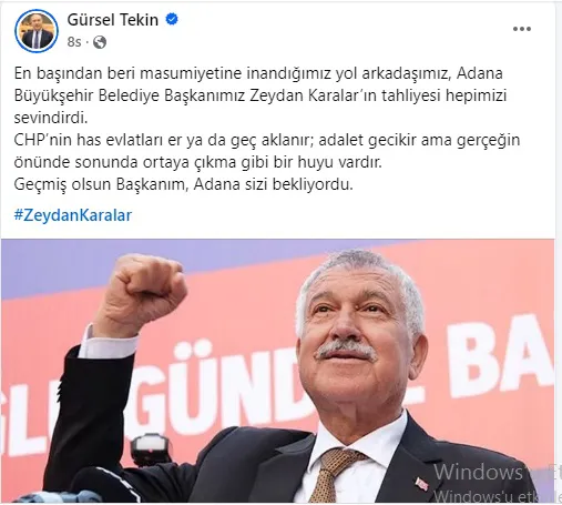 2 Eylül 2025 tarihinden bu yana mahkeme kararıyla tedbiren ve geçici olarak CHP İstanbul İl Başkanlığı görevine getirilen Gürsel Tekin, tahliye edilen Adana Büyükşehir Belediye Başkanı Zeydan Karalar ile ilgili paylaşımında, “Yol arkadaşımız” ifadesini kullandı.