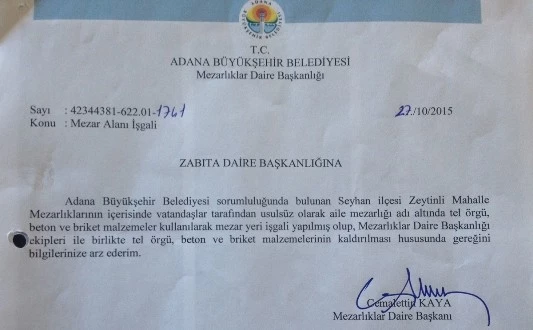 Adana Büyükşehir Belediyesi Mezarlıklar Daire Başkanlığı’nın Zeytinli Köyü Mezarlığı’nda tahribat gerçekleştirdiği yolunda bazı basın organlarında çıkan haberlerin gerçekleri yansıtmadığı ifade edildi. Adana Büyükşehir Belediyesi Mezarlıklar Daire Başkanı Cemalettin Kaya, Zeytinli Köyü Mezarlığı’nda bazı şahısların gelişigüzel aile mezarlığı çevirdiğini belirterek, izinsiz yapılan bu işlemin, muhtar ve köylülerin talebi ve belediyeye yapılan resmi başvurunun değerlendirilmesinin ardından, Adana Büyükşehir Belediyesi’nce engellendiğini söyledi. Cemalettin Kaya, “Cenazesi olmayan şahıs 5 kişilik, 10 kişilik yer çevirmiş. Tespitlerimiz, köy muhtarının resmi talebi ve köy sakinlerinin isteği üzerine böyle bir çalışma yaptık. İşgalin ortadan kaldırılması ve biriketlerin alınması için anons yaptırdık. Yer çevrilmesinin önlenmesi ve mezarlıkta köy sakinlerinin hakkını korumak için süre de verildi. Çevrildiği yerleri kaldıran kaldırdı, kaldırmayanlar için biz harekete geçtik. Öne sürüldüğü gibi mezarların üzerine moloz bırakılması söz konusu değil. Vatandaşı mağdur edecek işlem gerçekleştirmedik. Muhtarın ve Zeytinli sakinlerinin isteği, ayrıca resmi başvurusu üzerine harekete geçtik. Onların fikirlerini de alıp öyle karar verdik. ‘Allah razı olsun’ dediler. Daha sonra da düzenleme gerçekleştirip, mezarlığı tertemiz şekilde halkımızın hizmetine sunduk” diye konuştu.