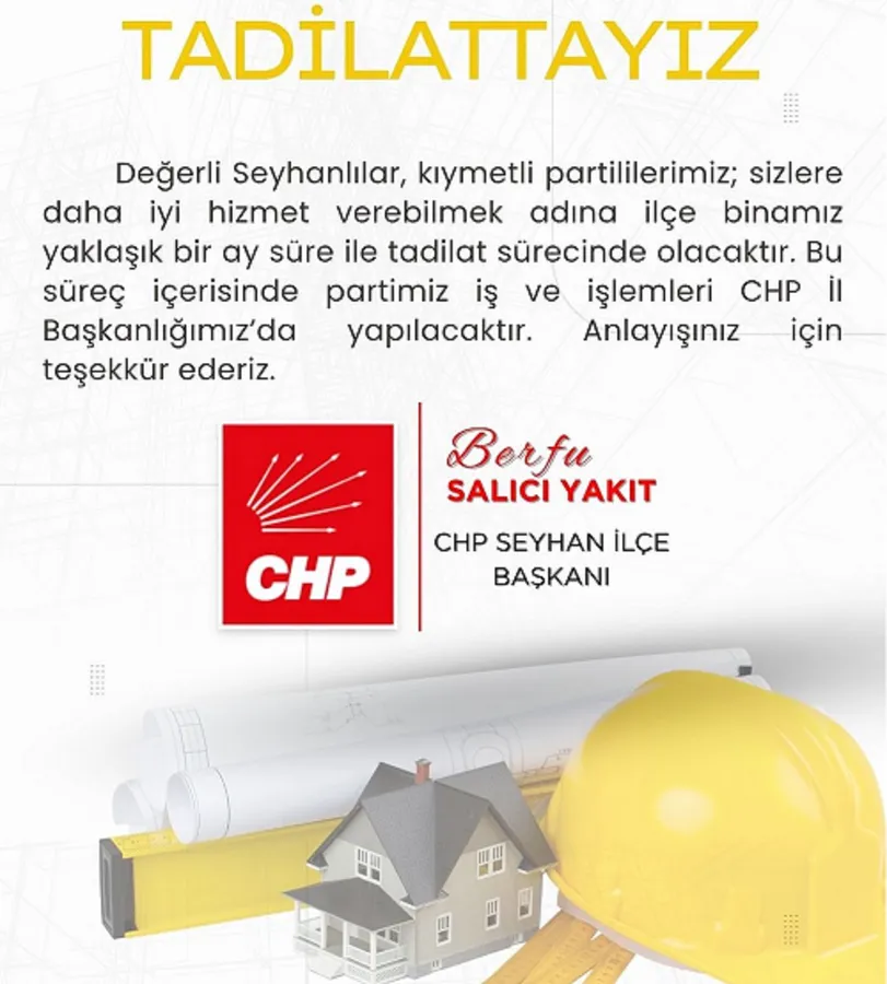 CHP Seyhan İlçe Başkanlığı binasının tadilata alındığı, çalışmaların bu süreçte il binasında süründürüleceği duyuruldu.