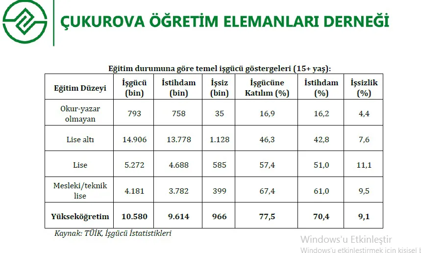 Kamuoyunda zaman zaman yükseköğretim mezunlarının büyük ölçüde işsiz olduğu yönünde yanıltıcı bir algı oluşturulmaktadır. Oysa resmi istatistikler bu iddiayı doğrulamamaktadır. Türkiye İstatistik Kurumu’nun (TÜİK) verilerine göre, eğitim düzeyine göre işgücüne katılım oranları incelendiğinde, en yüksek katılım oranı yükseköğretim mezunları arasında görülmektedir.
