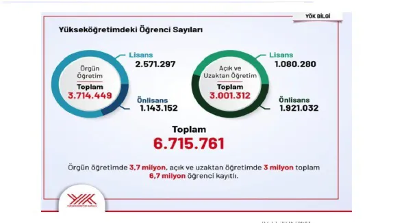 Türkiye’de aktif durumda bulunan 205 üniversite, 2068 fakülte, 327 yüksekokul, 1019 meslek yüksekokulu ve toplam 7227 aktif program bulunduğu belirtilen Çukurova Öğretim Elemanları Derneği Yönetim Kurulu açıklamasında, “Yükseköğretimde okuyan toplam öğrenci sayısı 6.715.761’dir. Bu öğrencilerin 3.064.184’ü meslek yüksekokullarında (ön lisans programlarında) öğrenim görmektedir. Buna ek olarak, 1.080.280 açık ve uzaktan öğretim lisans öğrencisi de bulunmaktadır.” denildi.