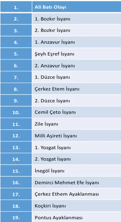 Birinci Dünya Savaşının sonu. 1919-1923 yıllarında Anadolu’da 19 adet iç isyan çıkmıştır. İsyanların çokluğu içteki mücadelenin ne denli zorlu, sürekli ve tehlikeli olduğunu ortaya koyar ve isyanlar en büyük zararı ulusal güçlerin birleşme sürecine vermişlerdir.